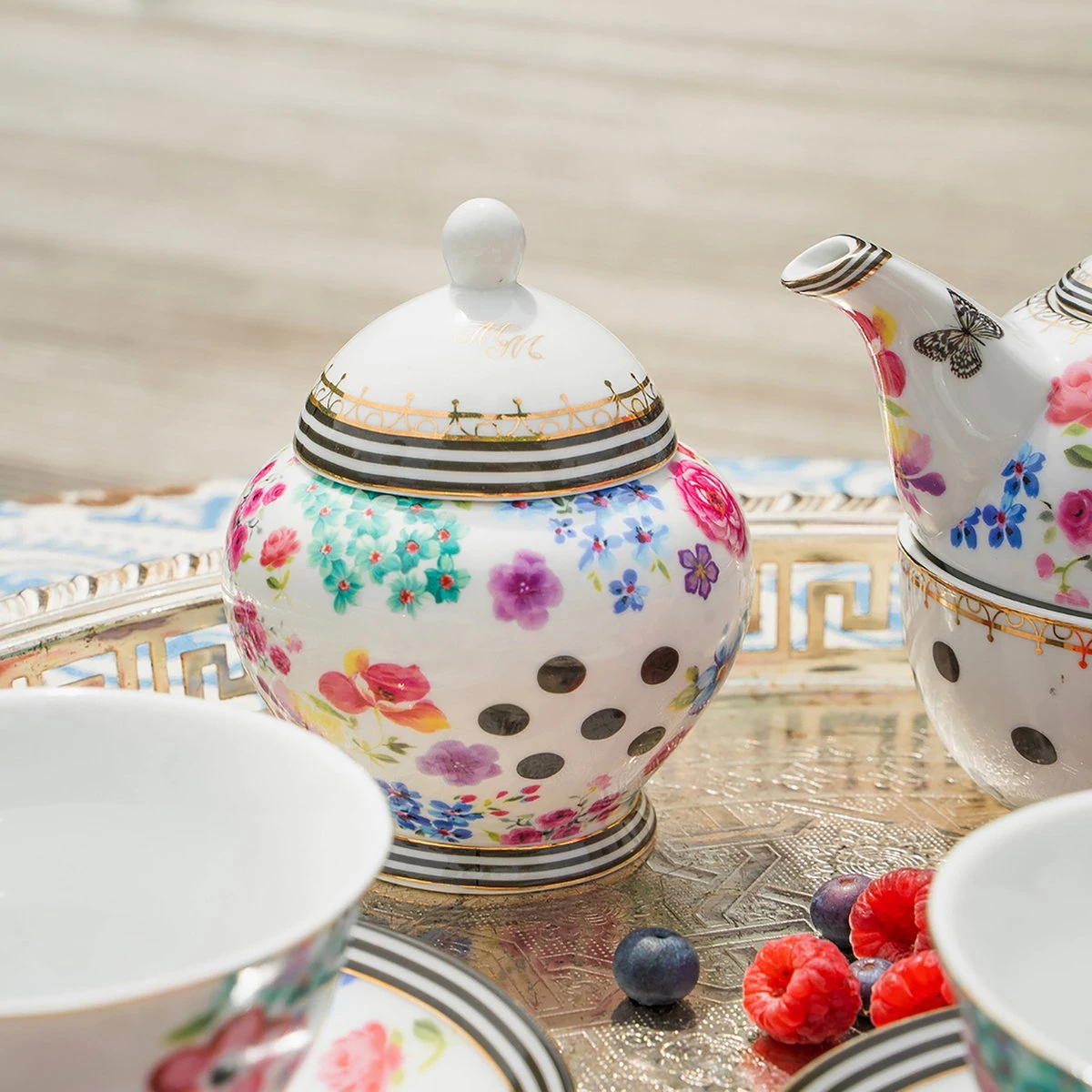 Dit Melli Mello Nora suikerpotje staat prachtig op jouw koffietafel. Het prachtige bloemendecor maakt dit item schattig en kleurrijk. De basiskleur is wit waarop roze, blauwe, paarse en turkooise bloemen te zien zijn. Dit in combinatie met zwart witte en gouden details maakt dit item vrolijk, fris en modern. Maak jouw koffie moment compleet met het melkkannetje of andere leuke serviesitems. De Melli Mello Nora suikerpot heeft een inhoud van 280 milliliter en is gemaakt van porselein.