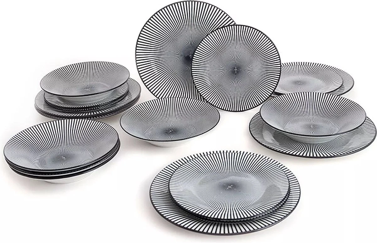 Prachtige bordenset uit porcelein bestaande uit 6 zwart-witte dinerborden, soepborden en dessertborden.